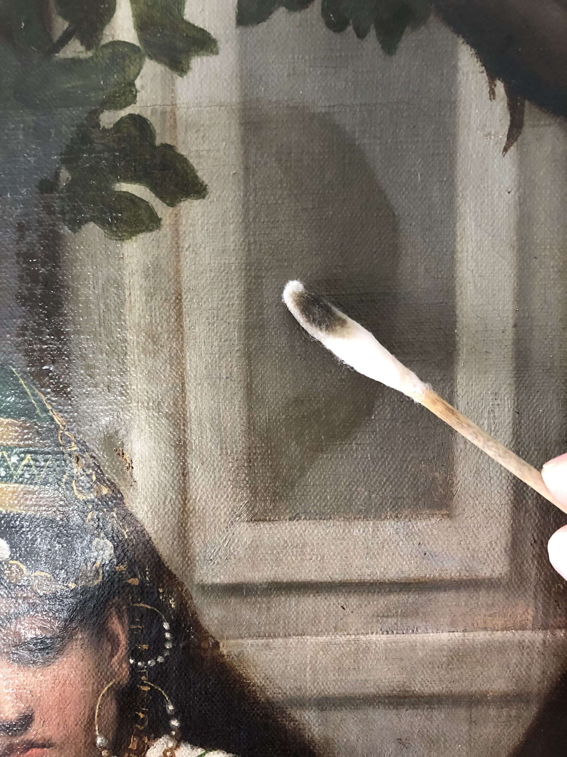 Proceso de restauración de pintura sobre lienzo.